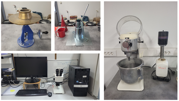 Figure 3. Lab equipment for mortars mixing, evaluation of their liquid-state properties and examining their microstructure.