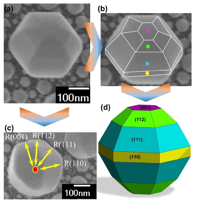 Figure: (a) FESEM image of an equilibrated Bi crystal. (b) The same crystal with outlined edges and colored planes. (c) Distances of the facets from the Wulff center at an equilibrium crystal detected at a 90° rotation (side view). (d) Corresponding representation of the Wulff shape of the crystal in Wulffmaker.